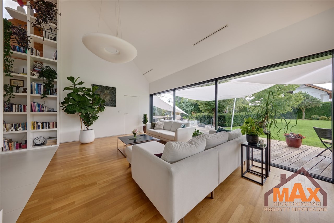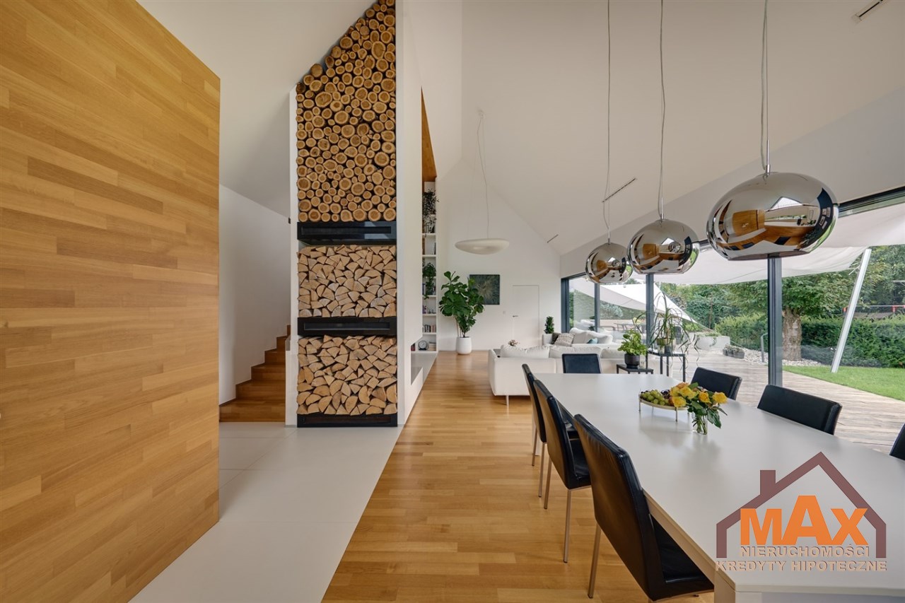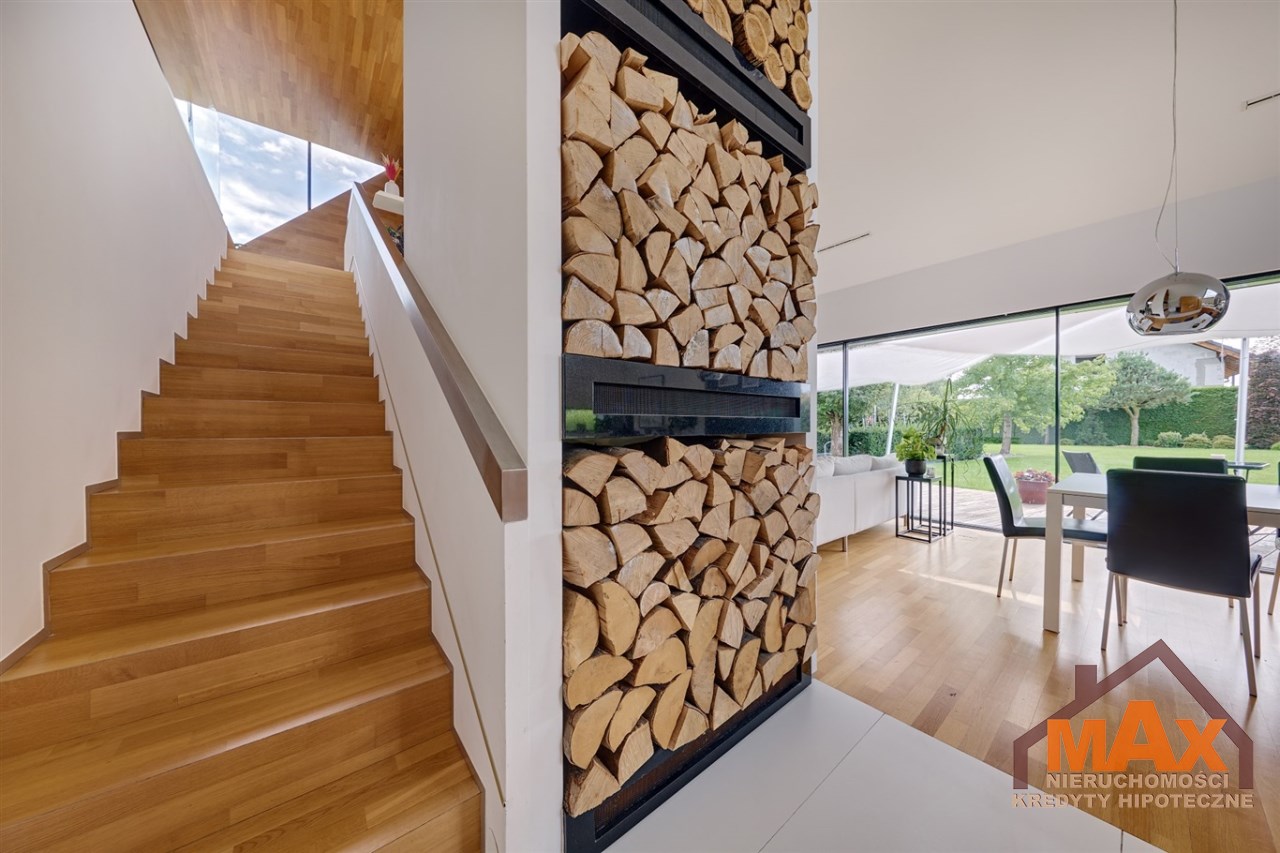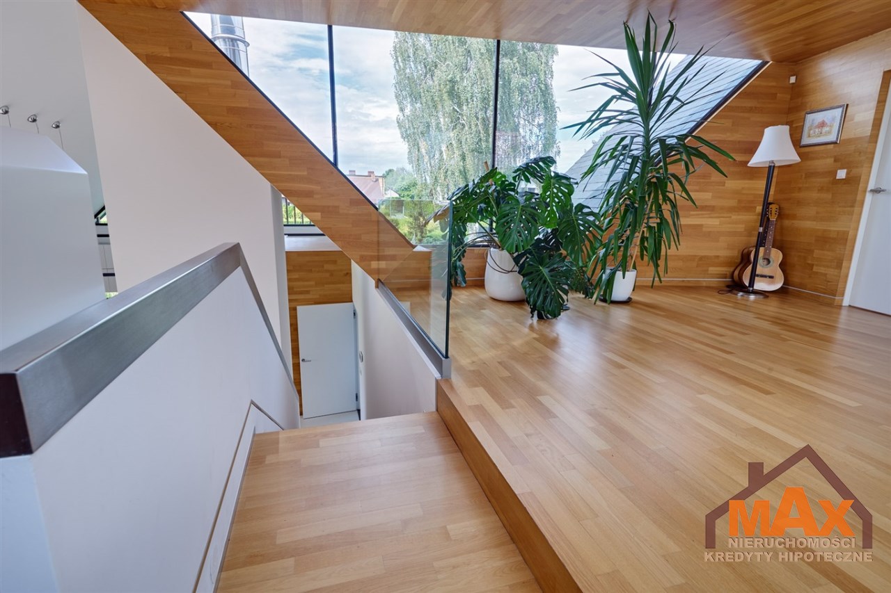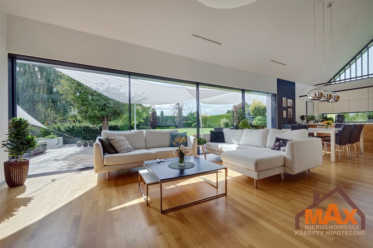 Wnętrze nieruchomości wykonane zostało z najwyższej klasy materiałów wykończeniowych. W salonie znajduje się 8 metrowe aluminiowe okno otwierane w 3/4 części, które otwiera dom na część ogrodową z dużym drewnianym tarasem. Na podłogach oraz ścianach parkiet dębowy.
