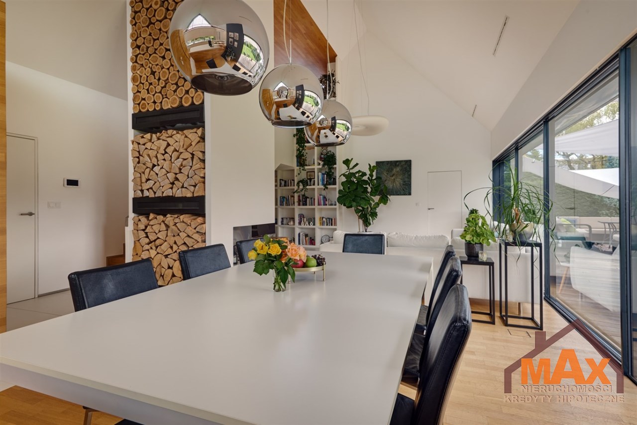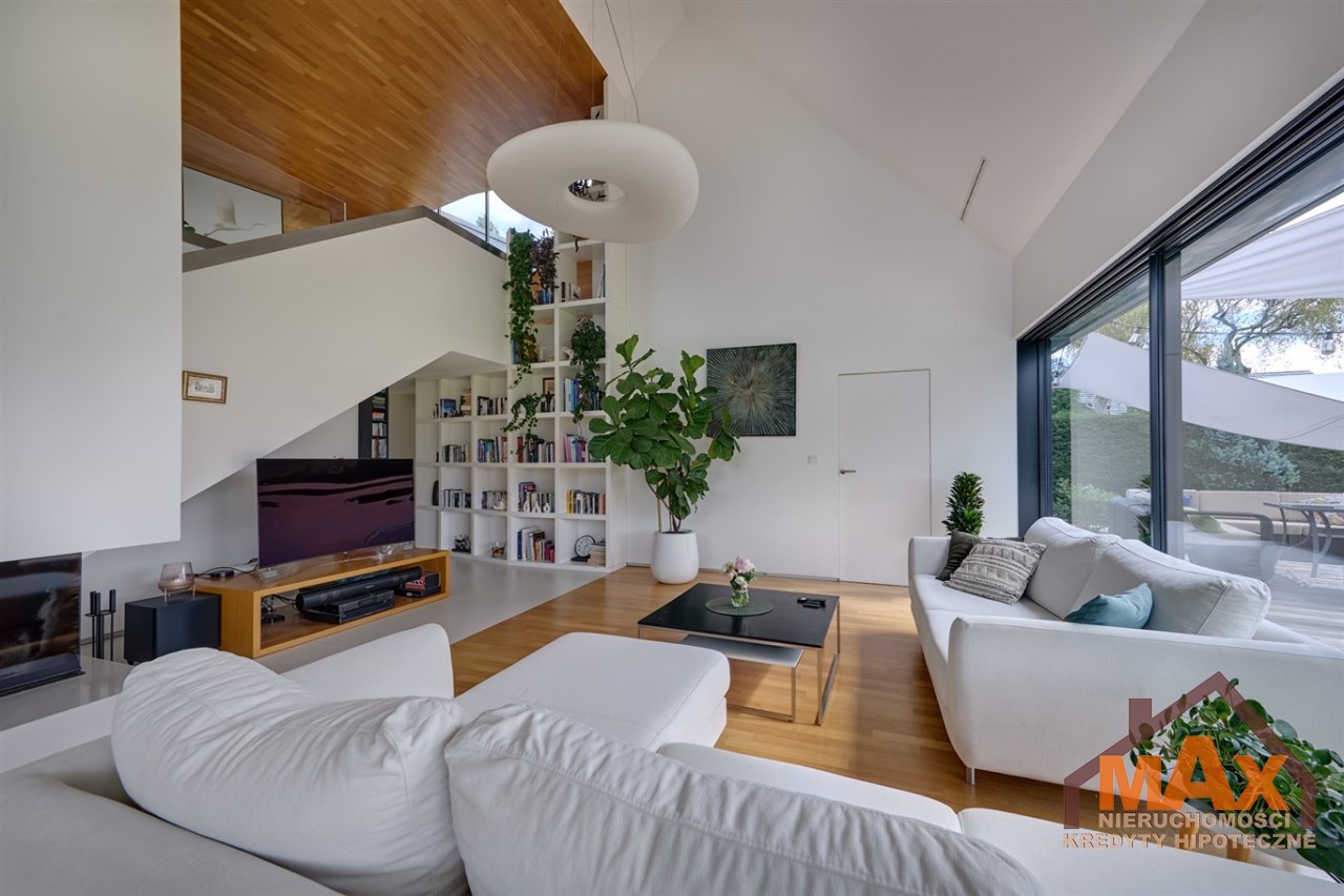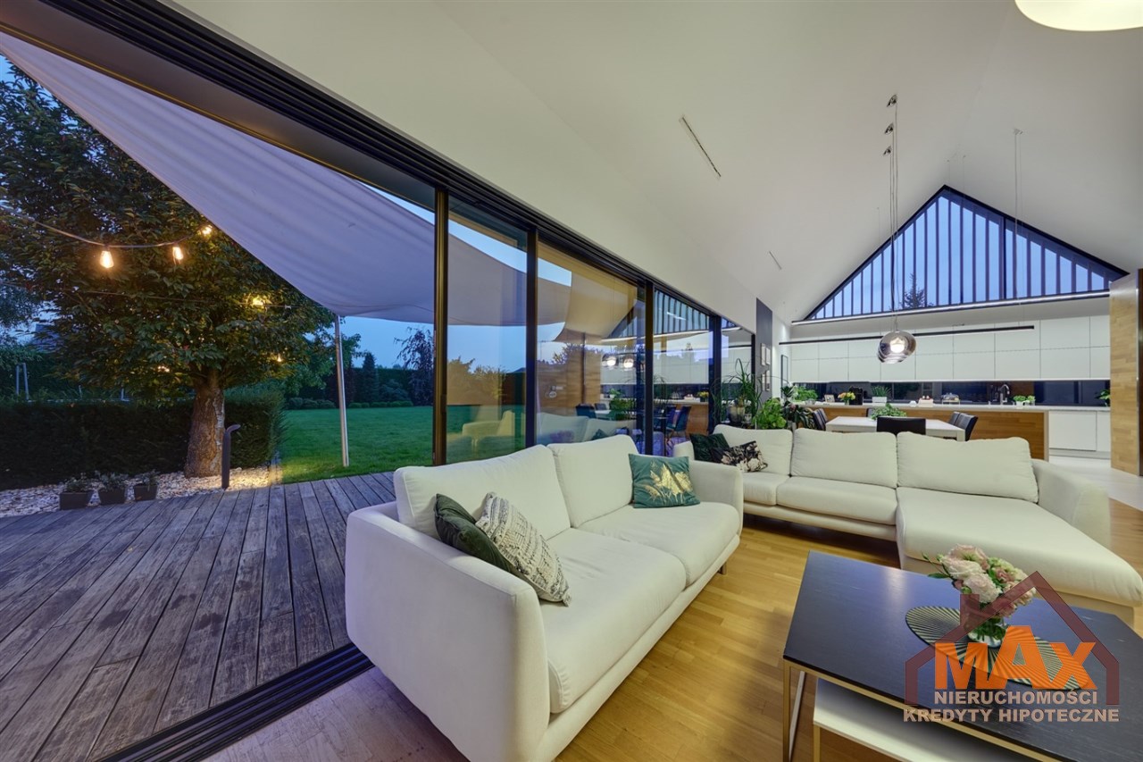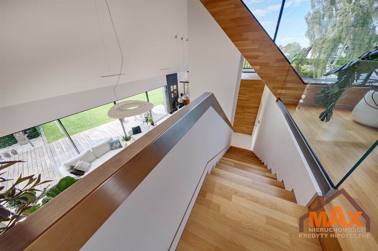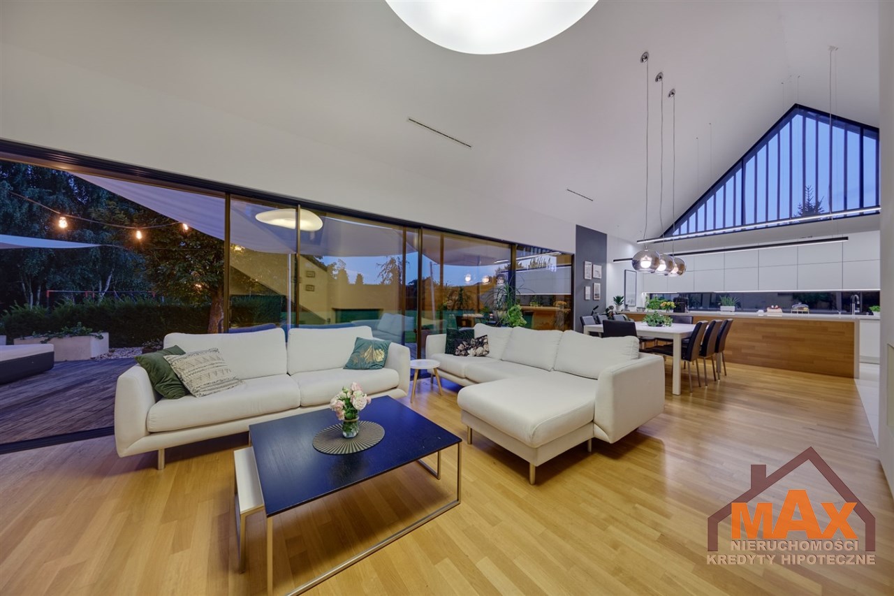 Wnętrze nieruchomości wykonane zostało z najwyższej klasy materiałów wykończeniowych. W salonie znajduje się 8 metrowe aluminiowe okno otwierane w 3/4 części, które otwiera dom na część ogrodową z dużym drewnianym tarasem. Na podłogach oraz ścianach parkiet dębowy.