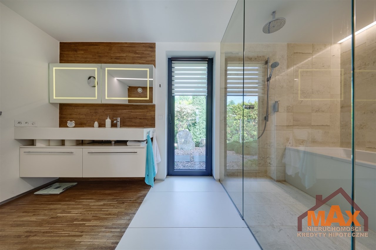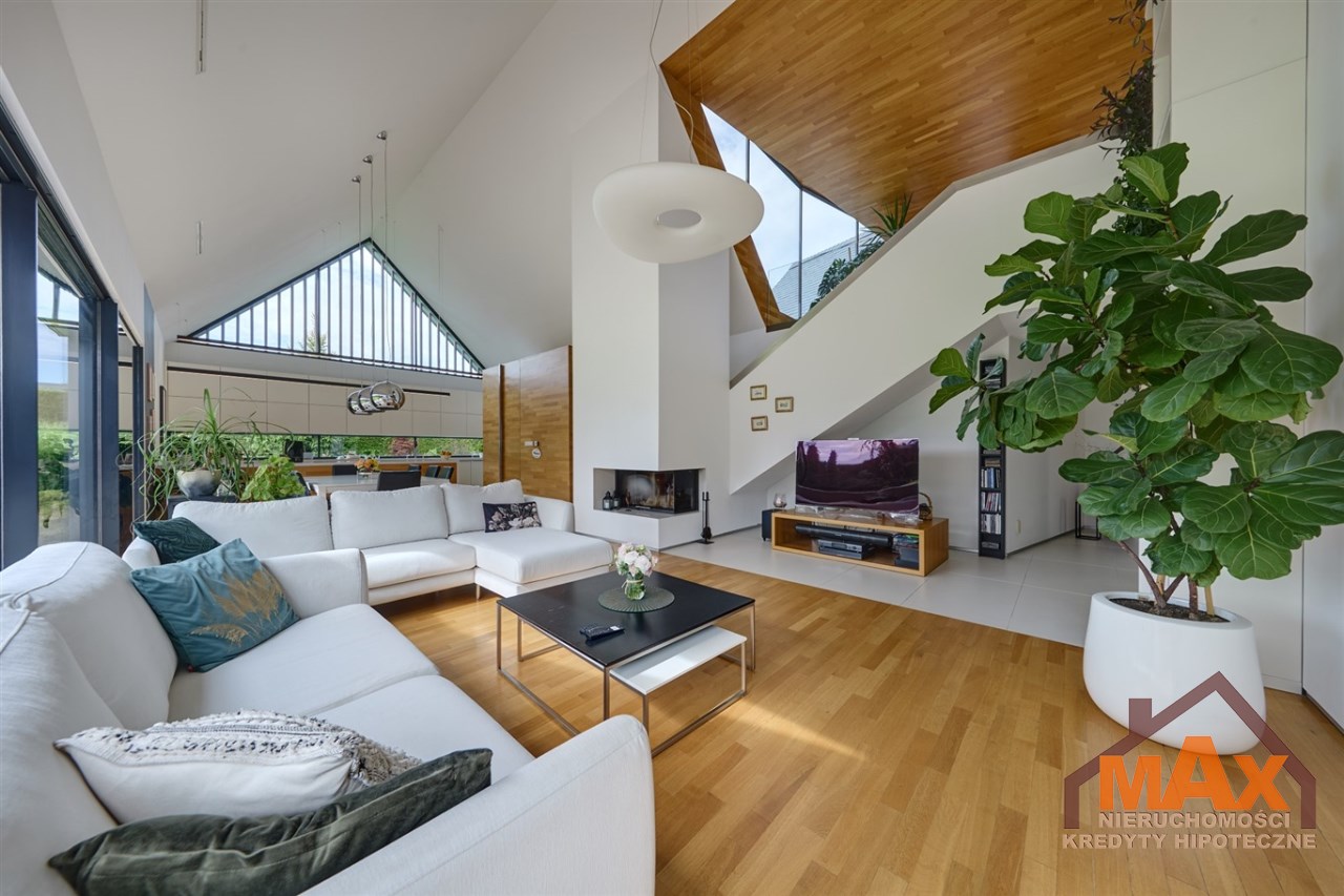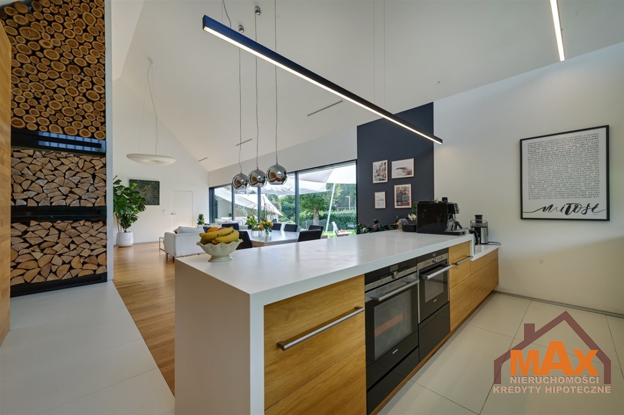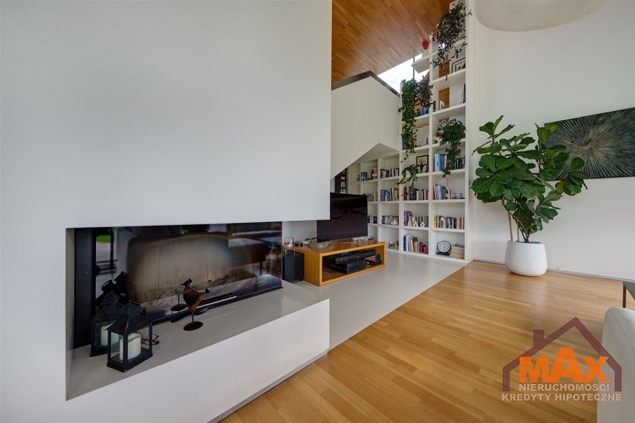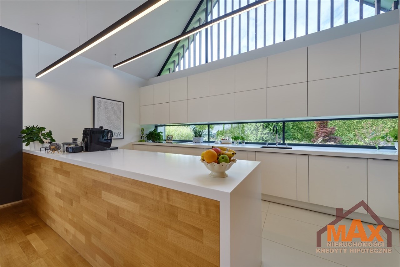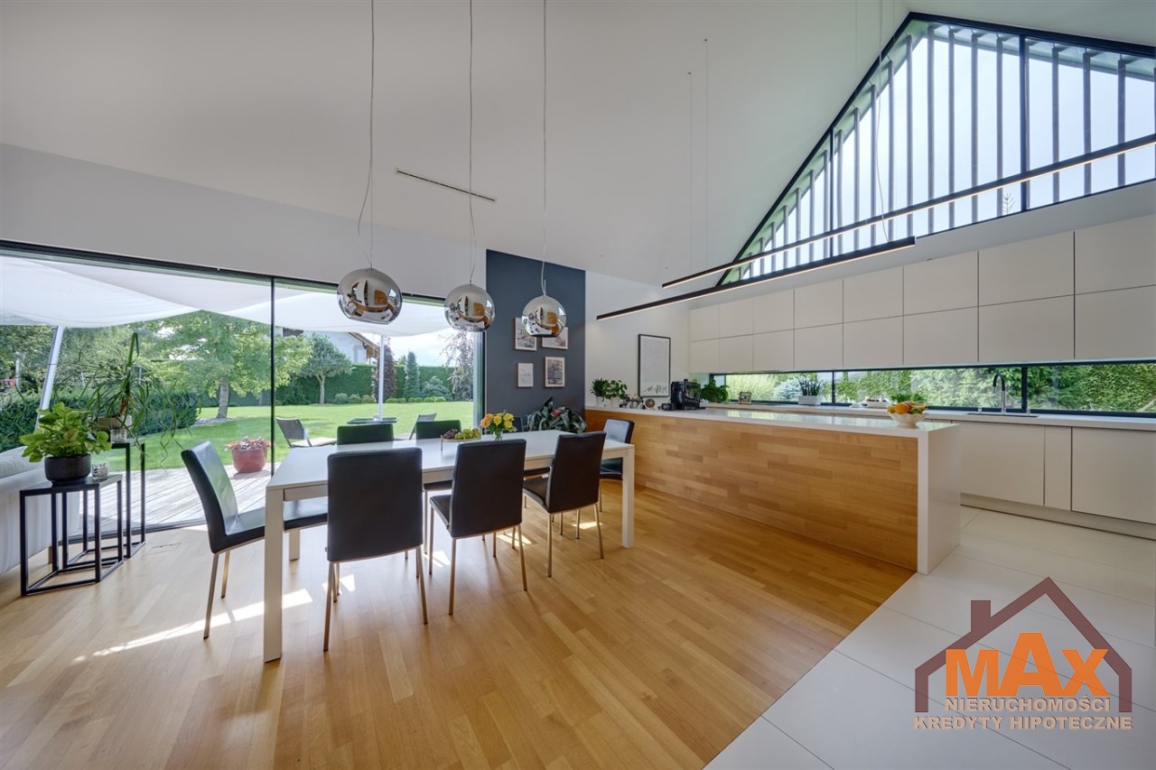 Wnętrze nieruchomości wykonane zostało z najwyższej klasy materiałów wykończeniowych. W salonie znajduje się 8 metrowe aluminiowe okno otwierane w 3/4 części, które otwiera dom na część ogrodową z dużym drewnianym tarasem. Na podłogach oraz ścianach parkiet dębowy.