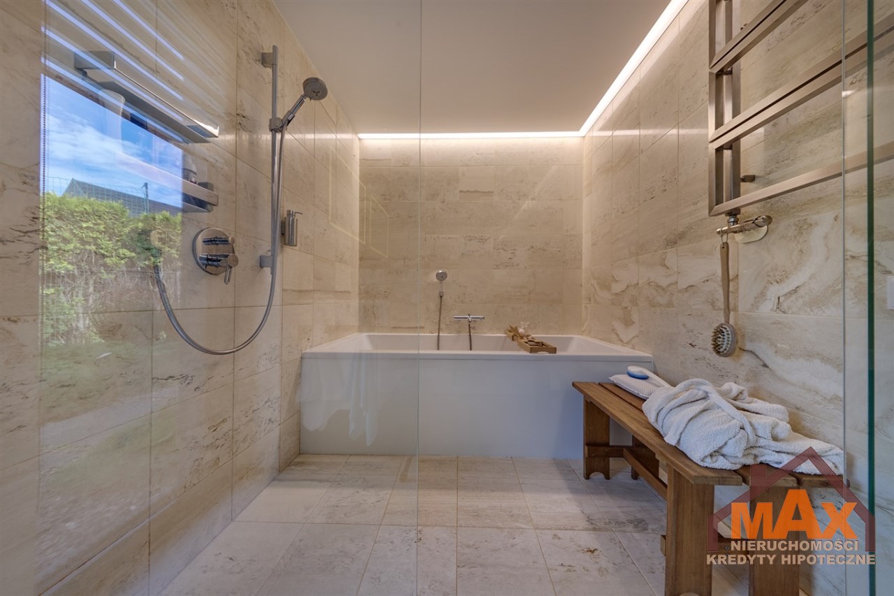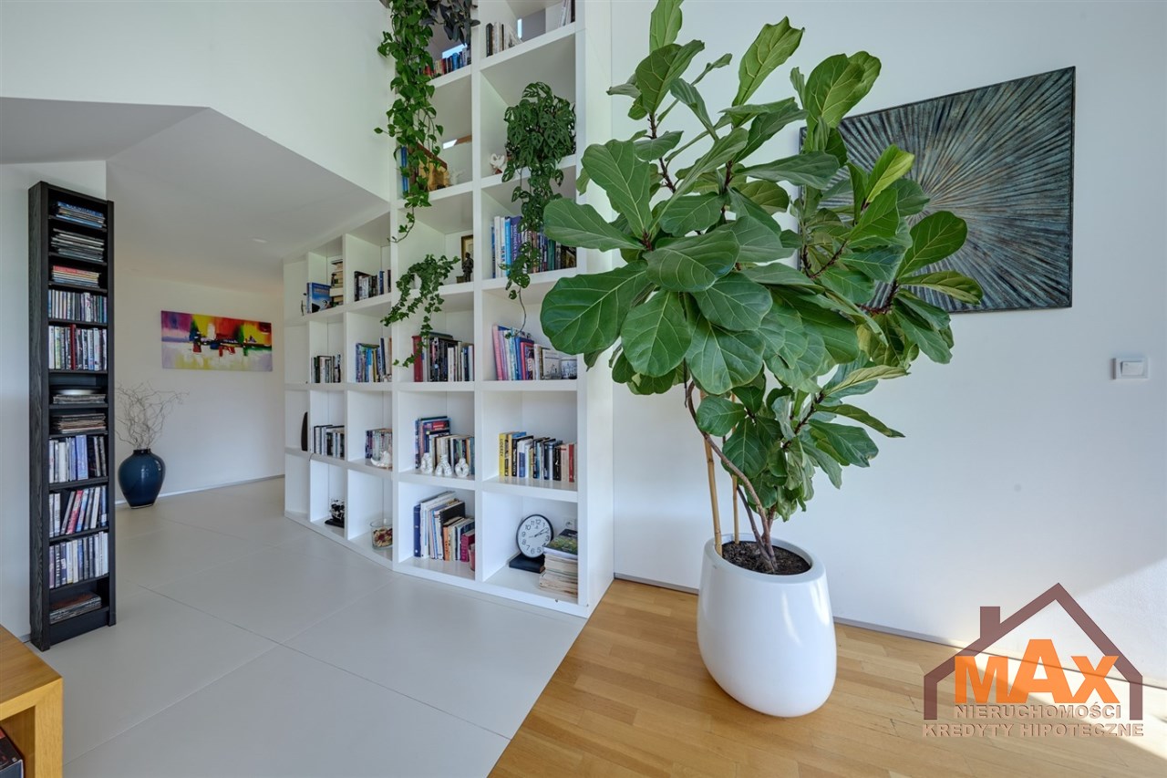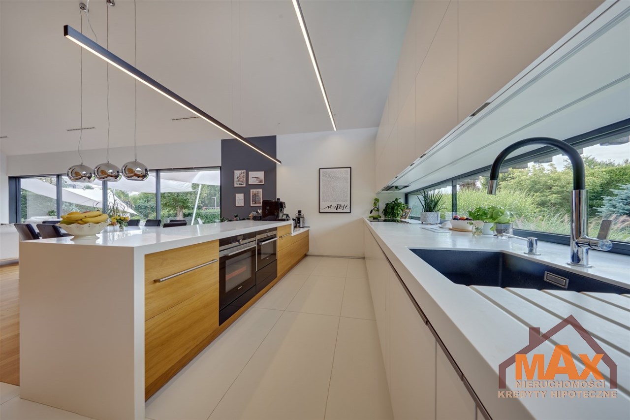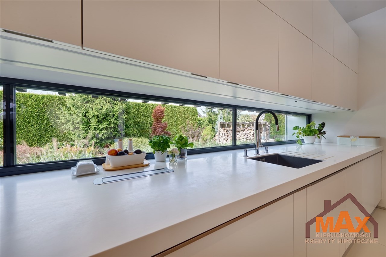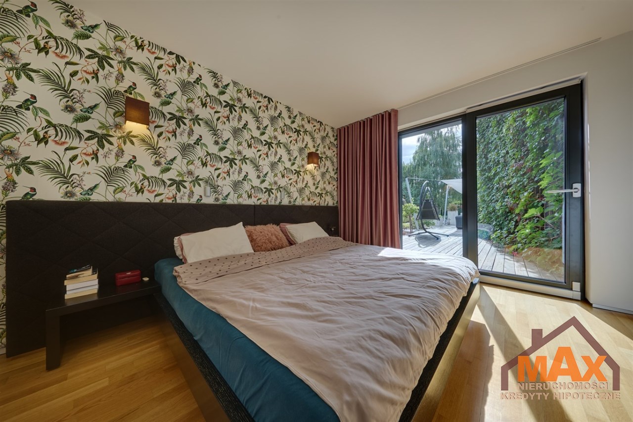 Wnętrze nieruchomości wykonane zostało z najwyższej klasy materiałów wykończeniowych. W salonie znajduje się 8 metrowe aluminiowe okno otwierane w 3/4 części, które otwiera dom na część ogrodową z dużym drewnianym tarasem. Na podłogach oraz ścianach parkiet dębowy.