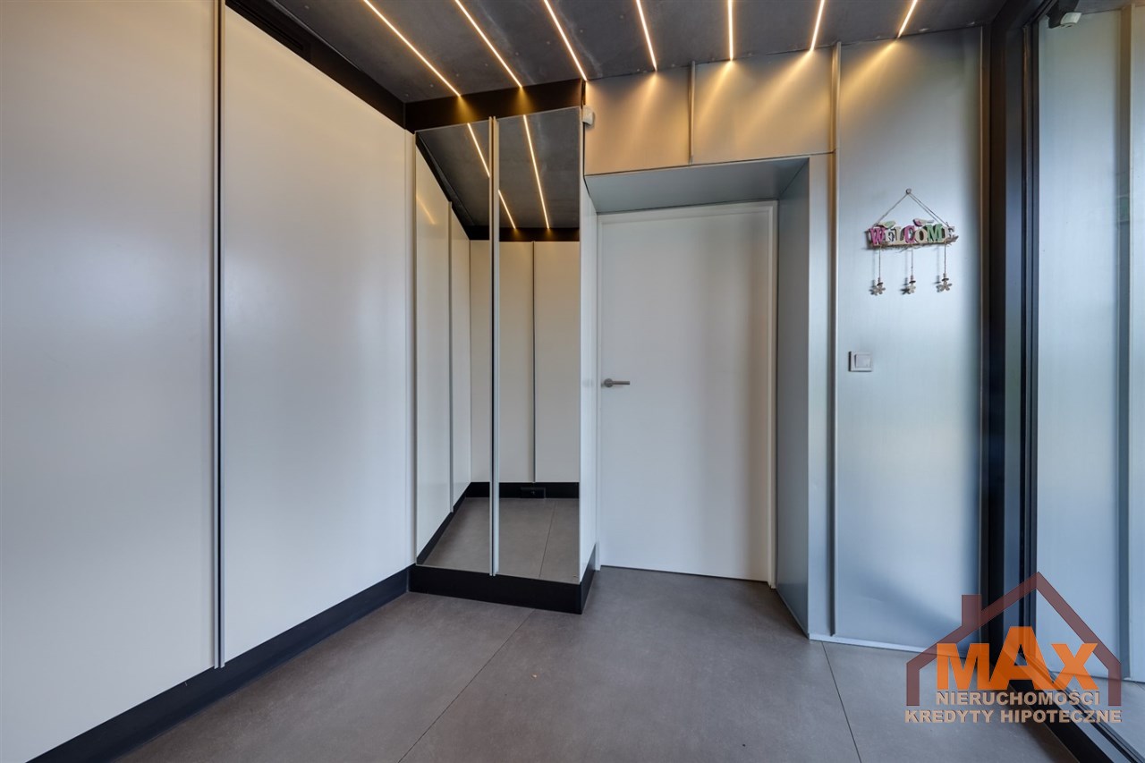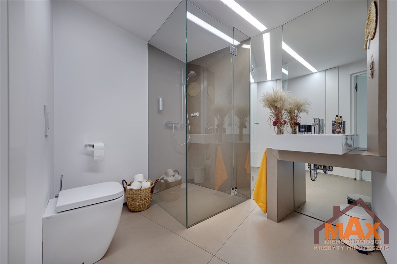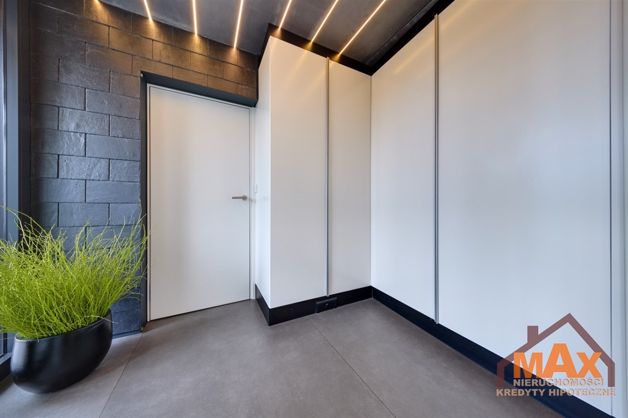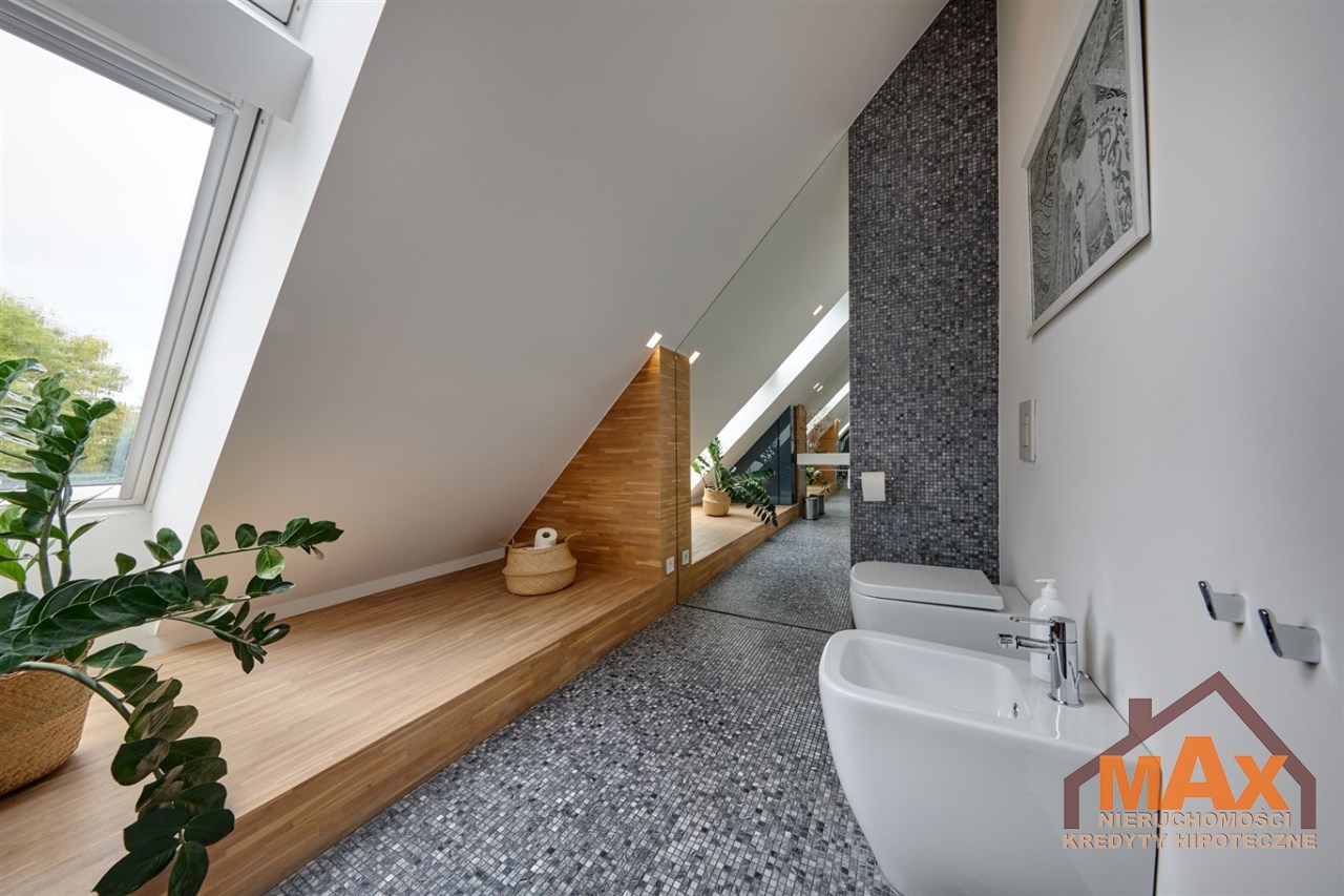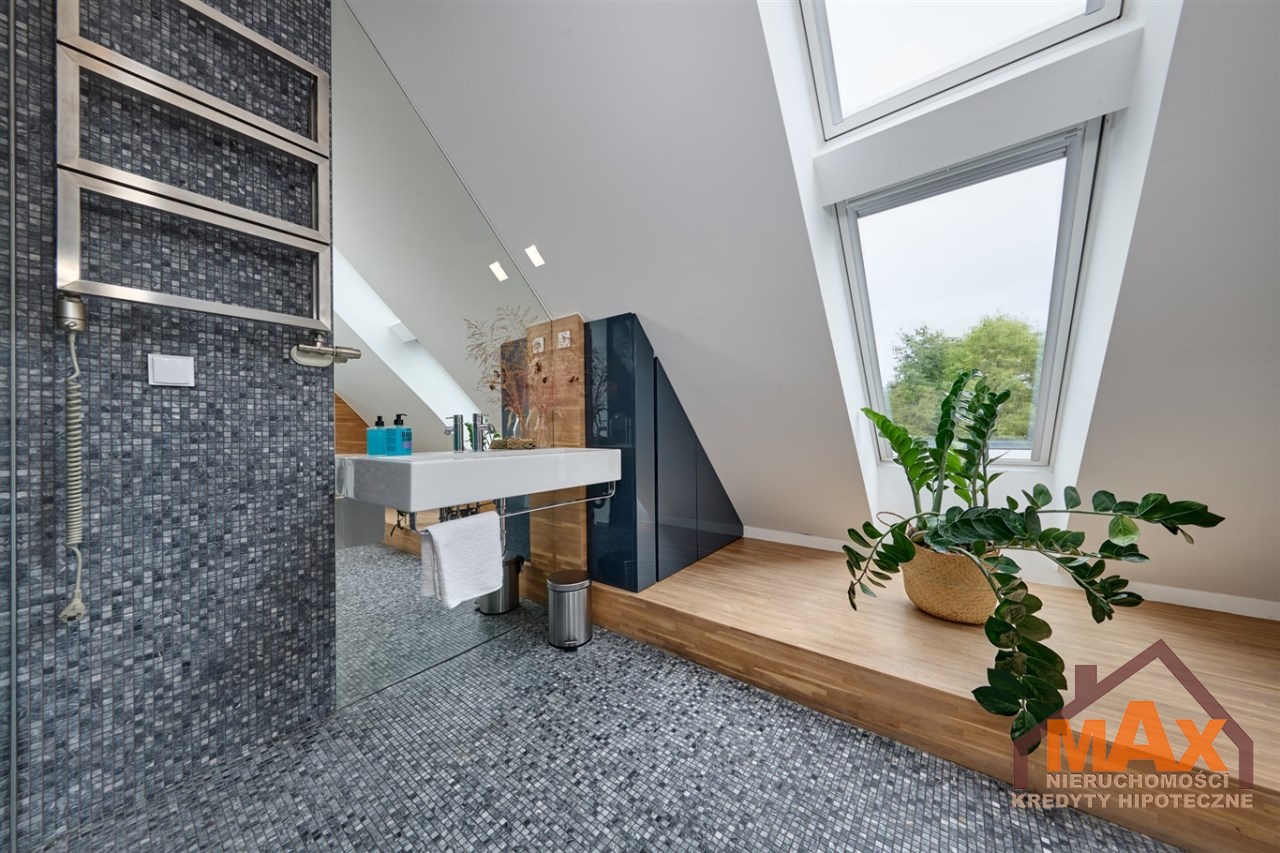 Wnętrze nieruchomości wykonane zostało z najwyższej klasy materiałów wykończeniowych. W salonie znajduje się 8 metrowe aluminiowe okno otwierane w 3/4 części, które otwiera dom na część ogrodową z dużym drewnianym tarasem. Na podłogach oraz ścianach parkiet dębowy.