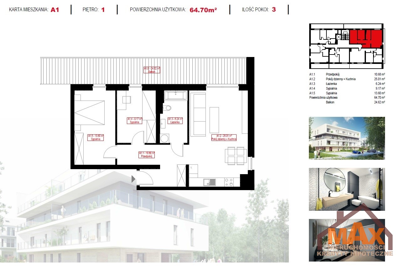 Mieszkanie na piętrze o powierzchni: 64,70 m2 + balkon 24,62 m2.